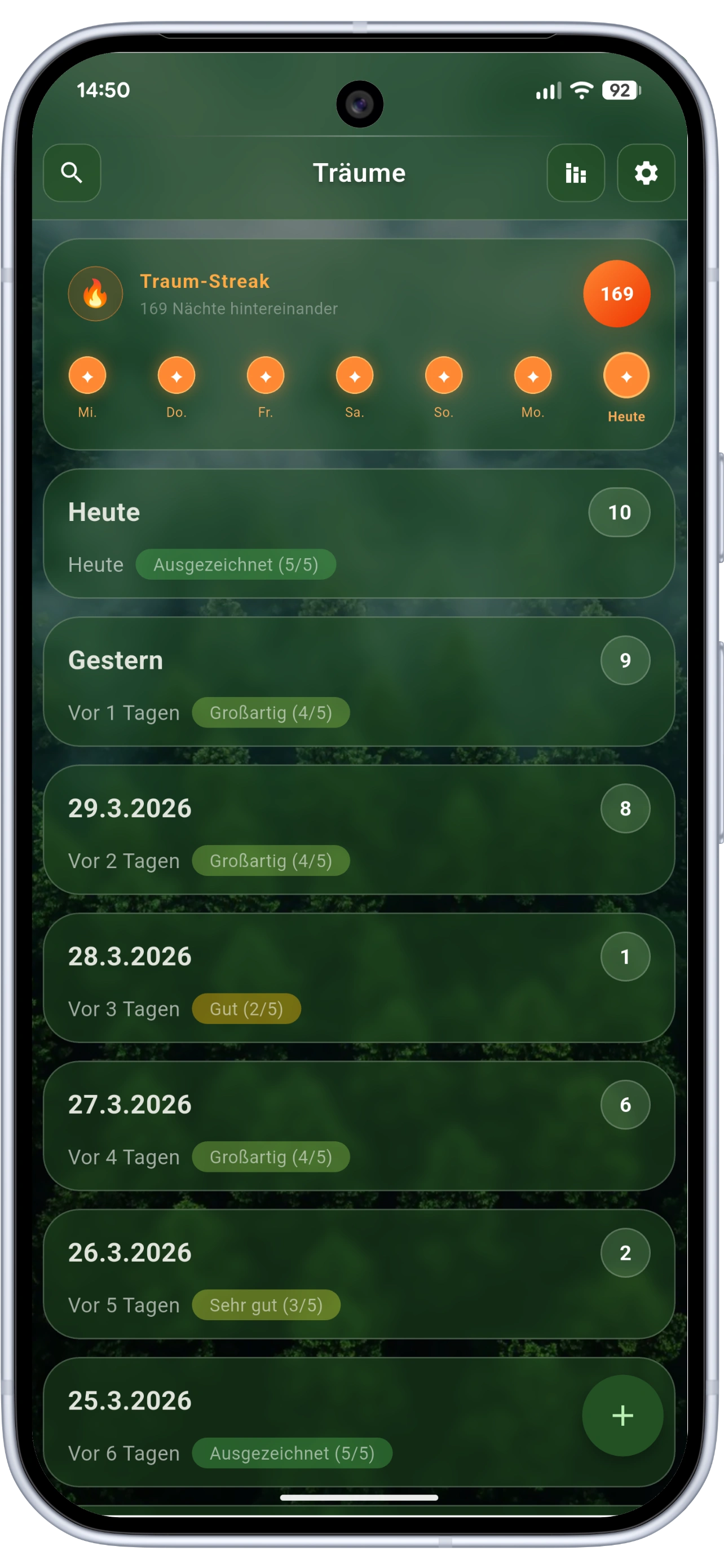 Die App motiviert dich, indem sie dir deine Streaks an Tagen anzeigt, an denen du mindestens einen Traum notiert hast. Außerdem erhält jeder Tag eine Bewertung, basierend darauf, wie detailliert (wie viele Wörter) und wie viele Träume du dich erinnerst. (Diese Funktionen können deaktiviert werden, wenn du einfach nur ein einfaches Tagebuch möchtest).