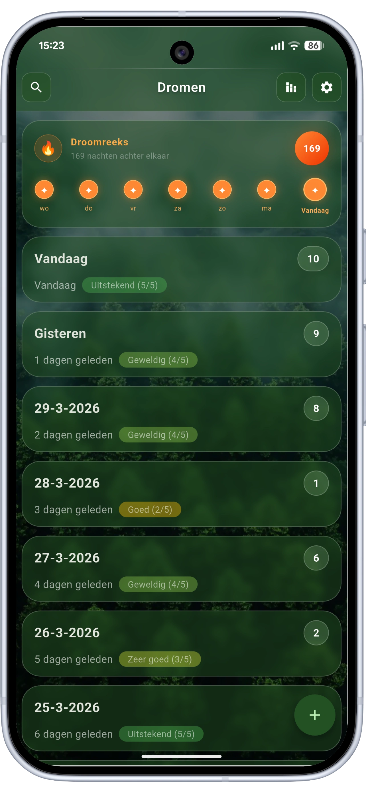 De app houdt u gemotiveerd door uw reeks dagen te tonen waarop u minstens één droom heeft genoteerd. Bovendien krijgt elke dag een beoordeling op basis van de hoeveelheid detail (het aantal woorden) en het aantal dromen dat u zich herinnert. (Deze functies kunnen worden uitgeschakeld als u gewoon een eenvoudige dagboekfunctie wilt).