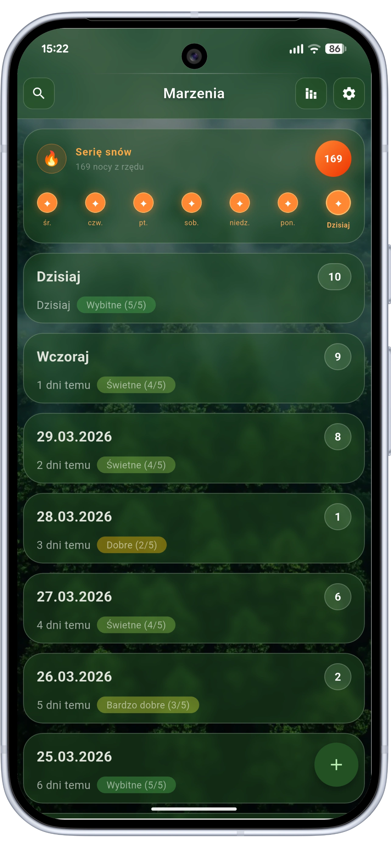 Aplikacja motywuje użytkownika, wyświetlając serię kolejnych dni, w których zapisano przynajmniej jeden sen. Co więcej, każdego dnia przypisywana jest ocena w oparciu o szczegółowość (ilość słów) i liczbę zapamiętanych snów. (Obie te funkcje można wyłączyć, jeśli chcesz mieć prosty dziennik).