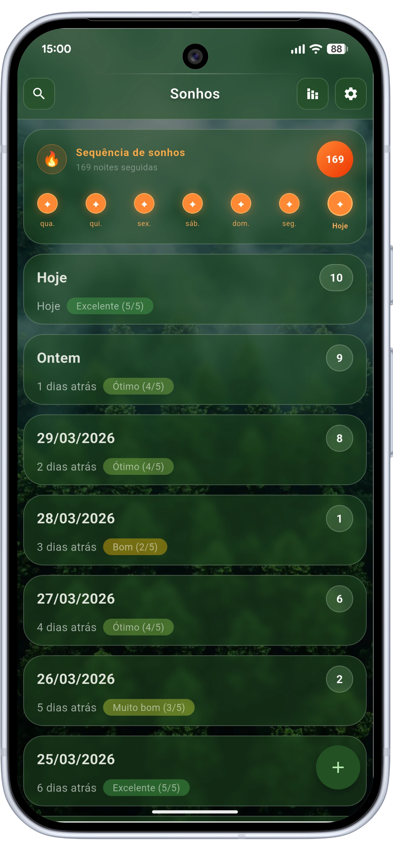 O aplicativo o mantém motivado, mostrando sua sequência de dias em que você registrou pelo menos um sonho. Além disso, cada dia recebe uma avaliação com base no nível de detalhe (número de palavras) e no número de sonhos que você se lembra. (Esses recursos podem ser desativados se você preferir um registro mais simples).
