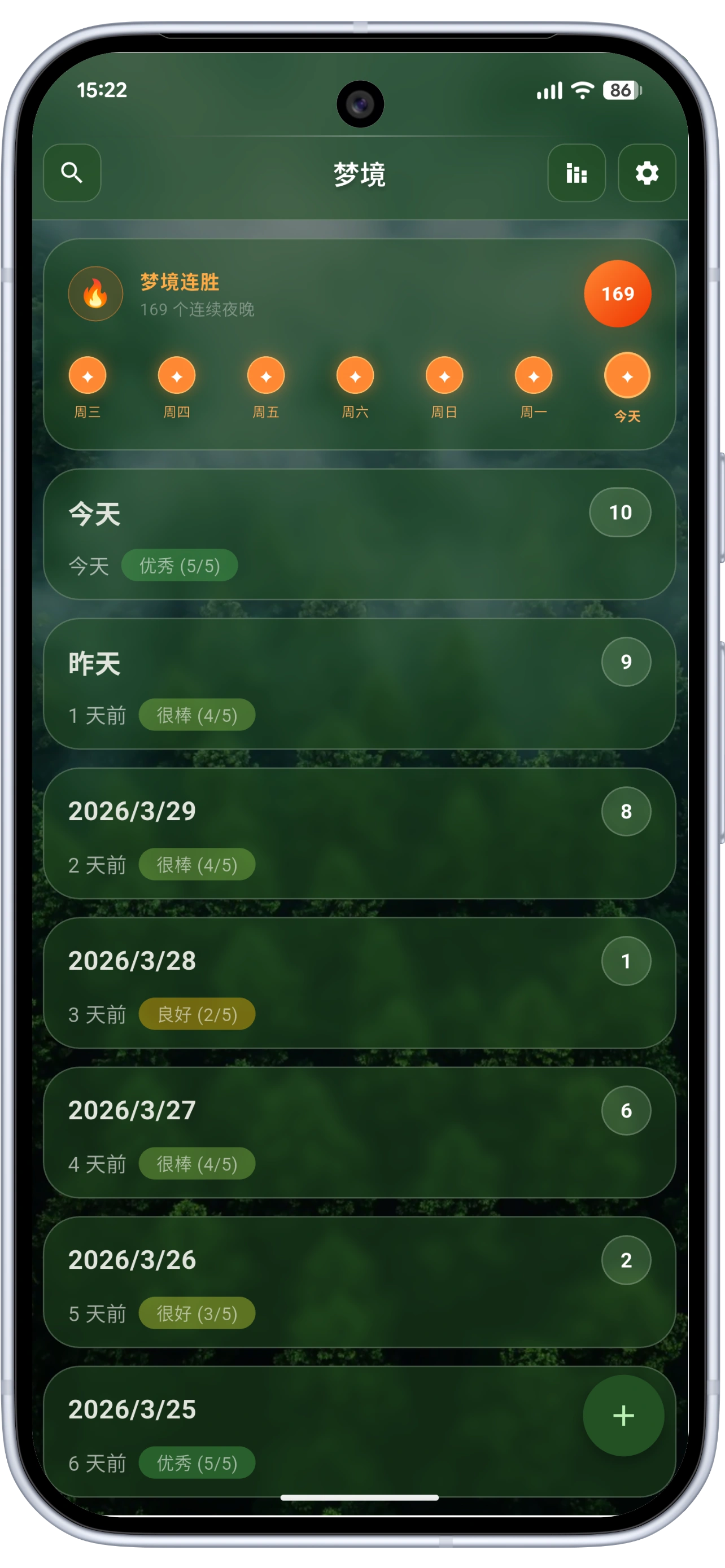 该应用程序通过显示您连续记录至少一个梦境的天数,来激励您。此外,每天都会根据您记录的梦境细节程度(字数)以及您记住的梦境数量进行评分。(如果您只想使用一个简单的日记,可以禁用这些功能)。